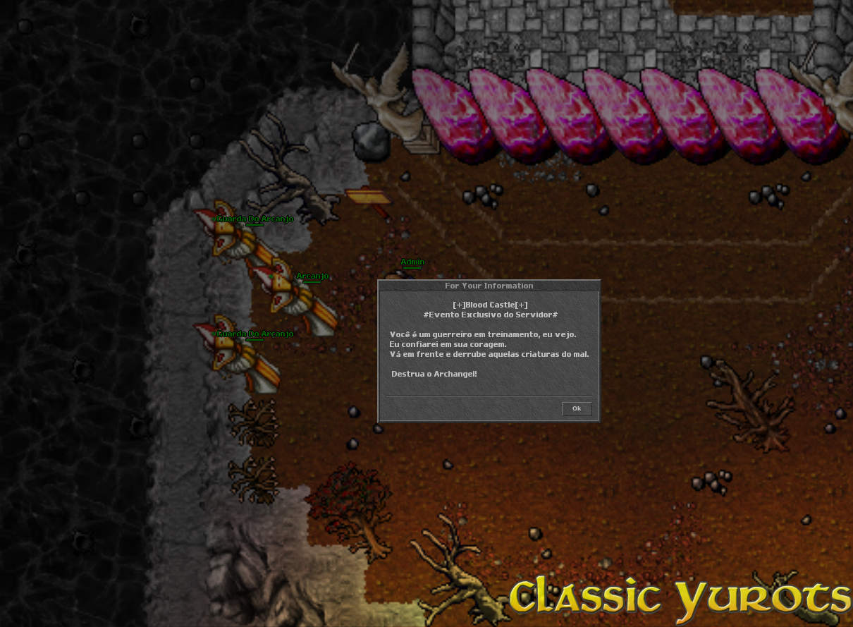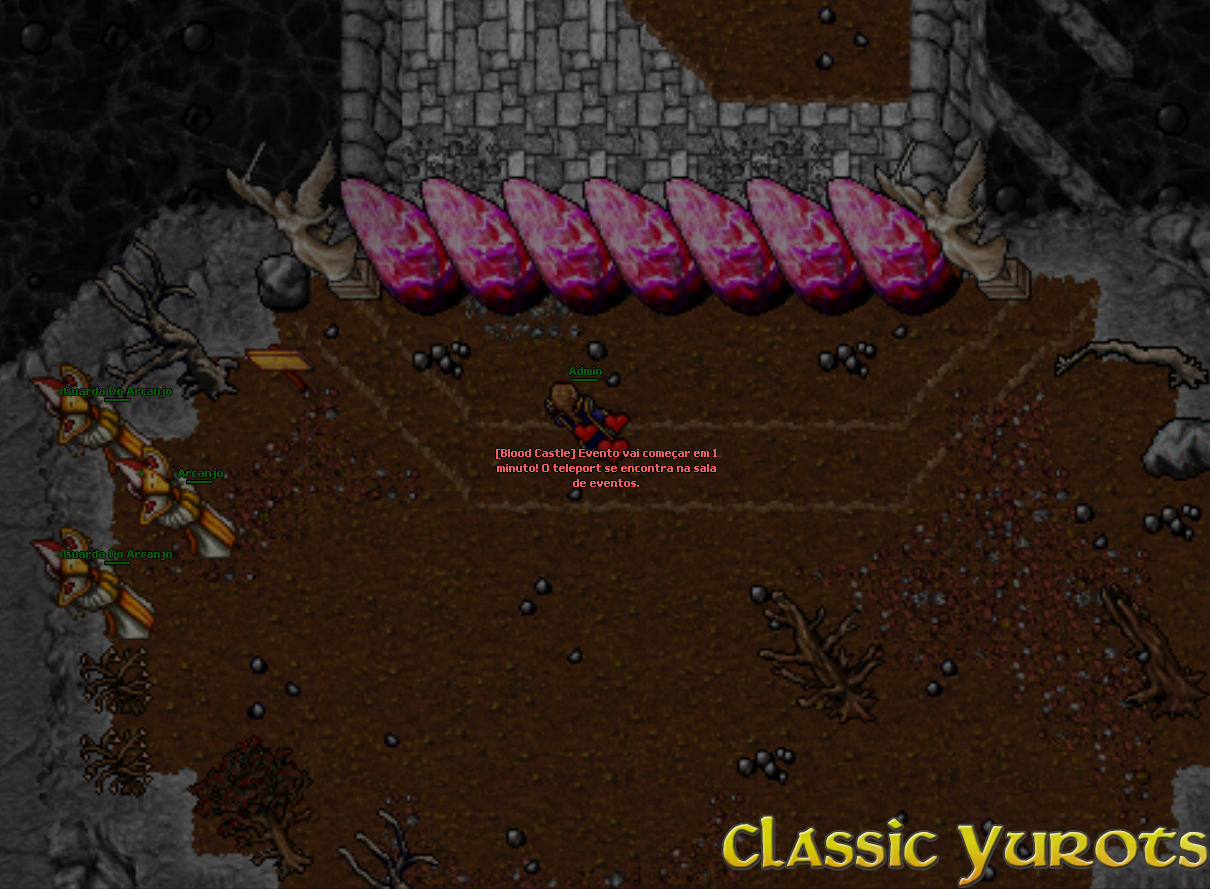 Quando o evento inicia uma mensagem é envianda no broadcast e um teleport aparece na sala de eventos. Em alguns minutos o evento será iniciado e as pedras serão removidas. Não é necessário falar com o NPC neste momento. Após as pedras serem removidas, haverá vários monstros ao caminho. No final, haverá uma alavanca. Para poder usar a alavanca é necessário elimitar todos os monstros da área. Quando a alavanca for acionada, você deverá destruir o portão para ter acesso ao Archangel. NOTE: Nenhuma Spell poderá ser utilizada para atacar o portão, apenas danos básicos. Após destruir o portão, o Archangel aparecerá e todos que estão no evento devem derrotá-lo. Assim que o Archangel for derrotado, todos os jogadores que deram ao menos 1 HIT devem falar com o NPC no ínicio do evento para pegar a recompensa. NOTE: A recompensa é enviada por parcel. |